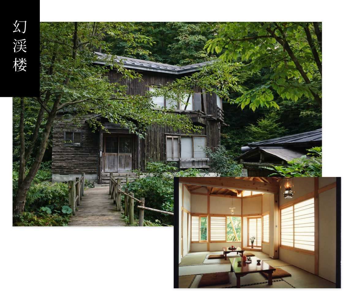 露天風呂を右手に見ながら奥へ進むと、斜面に寄り添うように建つ「幻渓楼」。